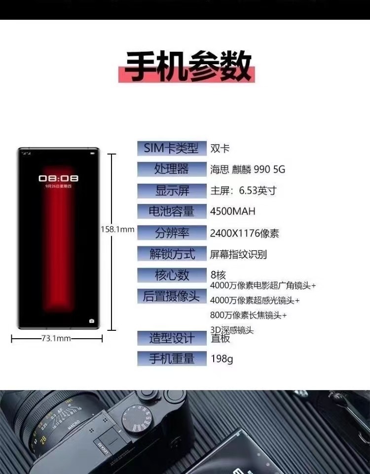主体 品牌 华为(HUAWEI) 型号 mate30rs保时捷 上市年份 2019年11月 智能机 是 操作系统 Android(安卓) CPU品牌 海思(Hisilicon) CPU型号 HUAWEI Kirin 990 5G(麒麟990 5G) CPU核数 八核 包装清单 手机(含内置电池)X1、快速指南*1、华为SuperCharge充电器X1、华为SuperCharge车载快速充电器X1、保修卡*1、Type-C 数字耳机X1、Type-C 数据线X2、取卡针*1、皮套*1、Type-C转3.5mm耳机转接线X1、真皮后盖保养卡X1、VIP*1(备注:最终以实物为准) 网络 2G网络制式 主卡:移动2G(GSM)/联通2G(GSM)/电信2G(CDMA 1X);副卡:移动2G(GSM)/联通2G(GSM)/电信2G(CDMA 1X);备注:*电信双卡时,副卡(非默认移动数据卡)不支持电信2G 3G网络制式 主卡:联通3G(WCDMA)/电信3G(CDMA 2000);副卡:联通3G(WCDMA) 4G网络制式 4G FDD-LTE(联通);4G TD-LTE(移动);4G FDD-LTE(联通、电信) 5G网络制式 移动5G;联通5G;电信5G 存储 运行内存 12GB 机身内存 512GB 显示 屏幕尺寸 6.53英寸 屏幕色彩 1670万色,DCI-P3广色域 感应器 重力感应 支持 摄像功能 后置摄像头 后置超感光徕卡电影四摄:4000万像素电影摄像头(超广角,f/1.8光圈)+4000万像素超感光摄像头(广角,f/1.6光圈,支持OIS)+800万像素长焦摄像头(f/2.4光圈,支持OIS)+3D深感摄像头,支持自动对焦备注:不同拍照模式的照片像素可能有差异,请以实际为准。 自动对焦 支持 前置摄像头 3200万像素(f/2.0光圈,支持固定焦距)+3D深感摄像头, 备注:不同拍照模式的照片像素可能有差异,请以实际为准。 娱乐功能 音乐播放 支持 视频播放 支持 电视播放 支持 录音 支持 其他 电池容量(mAh) 4500mAh(典型值) 电池更换 电池不可拆卸 机身尺寸(mm) 158.1*73.1*9.3mm 机身重量(g) 约198克(含电池)